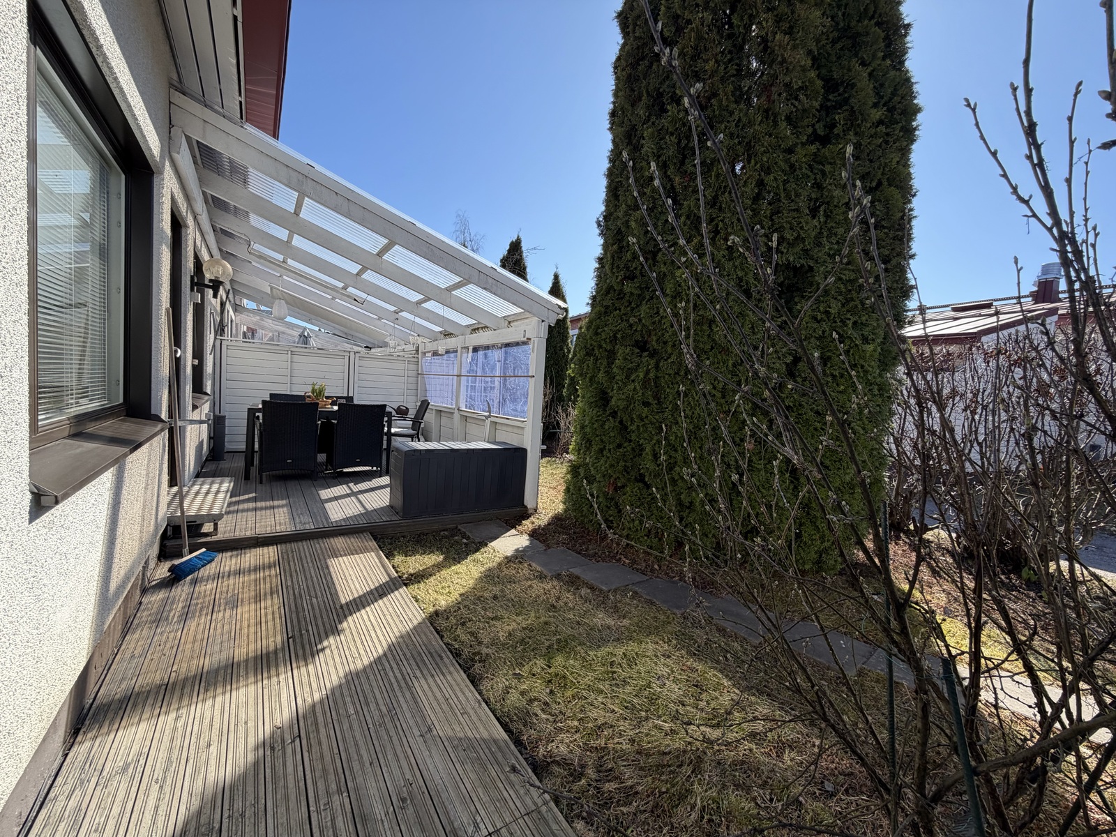 Oma suojaisa takapiha viihtyisällä valokatetulla terassilla. Kylmä ulkovarasto sisäänkäynnin yhteydessä ja autopaikat lähellä sähköauton latausmahdollisuudella. Taloyhtiössä on mm. pesutupa, kuivaushuone, pyörävarasto, kerhohuone ja laajakaista.