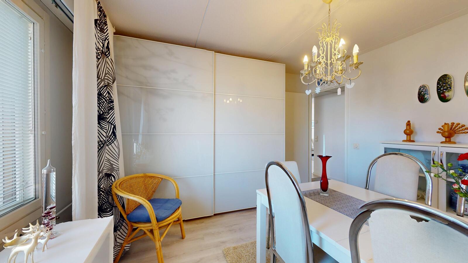 Yksitasoinen, avara ja valoisa päätyasunto, jonka kaunis avokeittiö on remontoitu 2015, kaksi tilavaa makuuhuonetta, ikkunalliset kylpyhuone ja sauna sekä erillinen wc.