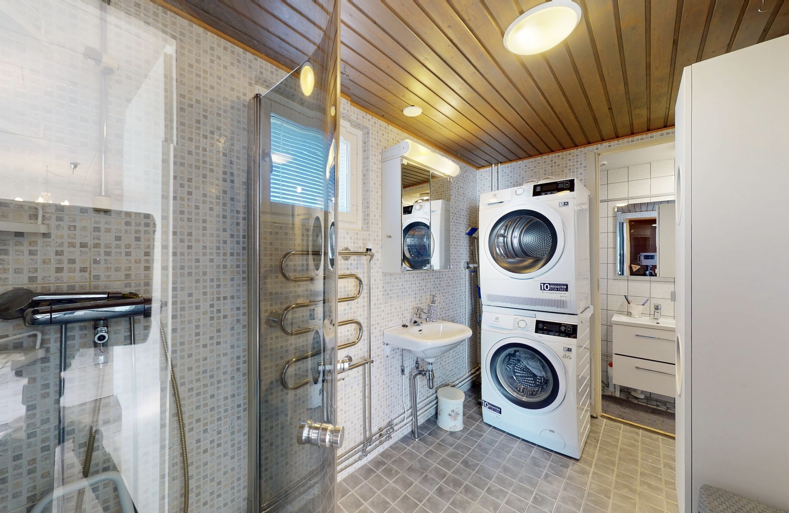 • Varusteet: suihkuseinä, pesukoneliitäntä, lattialämmitys, suihku, peilikaappi, kiinteät valaisimet, kylpyhuonekaapisto