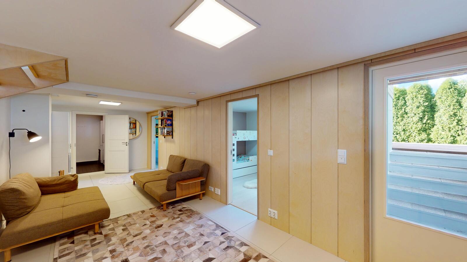 Alakerta tuo arkeen lisää toimivuutta ja tunnelmaa: takkahuone varaavalla takalla avautuu suojaisalle patiolle, ja lisäksi löytyy kodinhoitohuone, pesutilat, sauna sekä kaksi monikäyttöistä huonetta ihanteellisia makuu-, työ- tai askartelutiloiksi.
